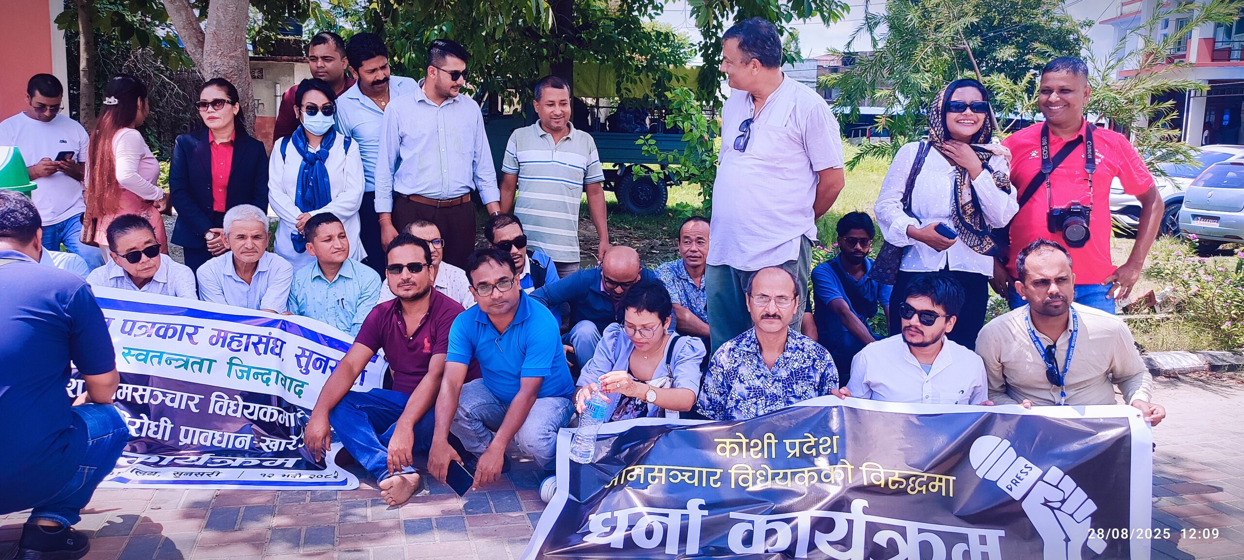 यसैक्रममा सुनसरीका पत्रकारहरुले समेत जिल्ला प्रशासन कार्यालयमा शान्तिपूर्ण धर्नासँगै विद्येयक खारेजीको माग गरेका छन्