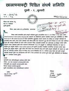दुहबी / दुहबी ६ स्थित रहेको टैनरिजछाला उद्योग लाई वातावरणिय मुल्यांकन (IEE) गर्न सिफारिस नदिन नगर प्रमुख र वडा कार्यालय लाई गत मंगलबार लिखित रुपमा छाला उद्योग विरुद्ध बनेका स्थानीय संघर्ष समितिले आग्रह गरेका छन।