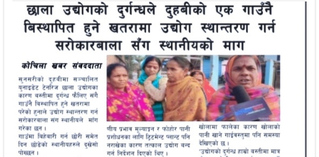 दुहबी / सुनसरीको दुहबीमा सञ्चालित युनाइडेट टेनरिज छाला उद्योगका कारण बस्तीमा दुर्गन्ध फैलिए संगै गाउँनै बिस्थापित हुने खतरामा परेको हुनाले उद्योग यिस्थान्तरन गर्न सरोकारबाला संग स्थानीयले माग गरेका छन ।